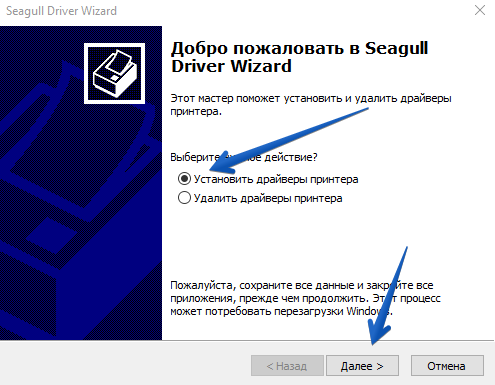 В окне мастера установки выберете «Установить драйверы принтера» и нажмите «Далее» (рис.4).