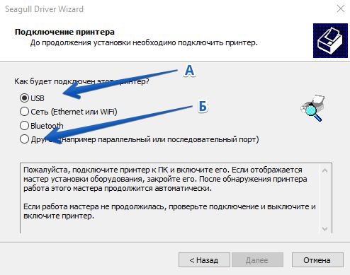 А - программа обнаружит подключенный принтер и предложит установить драйвер (рис.6); Б - «Другое» если принтер не обнаружен автоматически (рис.7).
