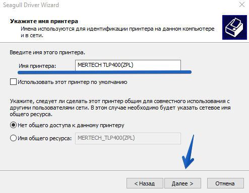 При необходимости введите другое имя принтера, назначьте принтером по умолчанию или предоставьте общий доступ по локальной сети и нажмите «Далее» (рис.9).