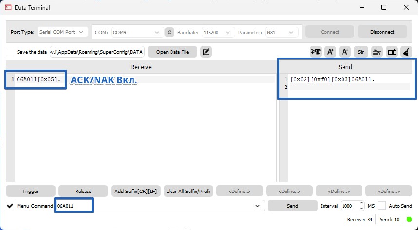 После передачи данных сканер ожидает ответа от хоста в виде символа ACK (шестнадцатеричное число 06) или символа NAK (шестнадцатеричное число 15).