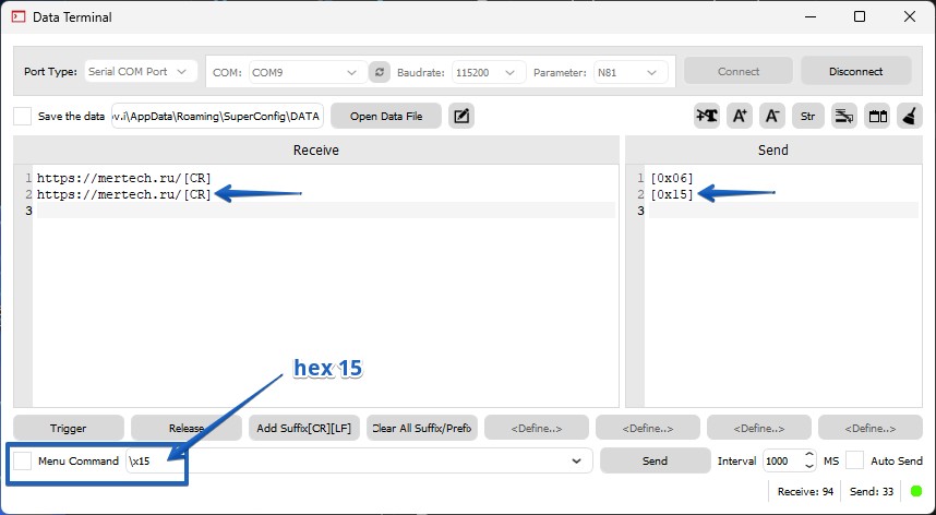 Шаг 3: Отправка команды NAK (шестнадцатеричное число 15) приведет к повторному получению последних данных штрих-кода.