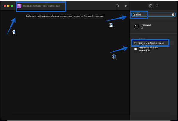 Вводим название команды на английском, в поиске справа пишем «shell» и перетаскиваем «Запустить Shell-скрипт» в левое пустое окно (рис. 4).