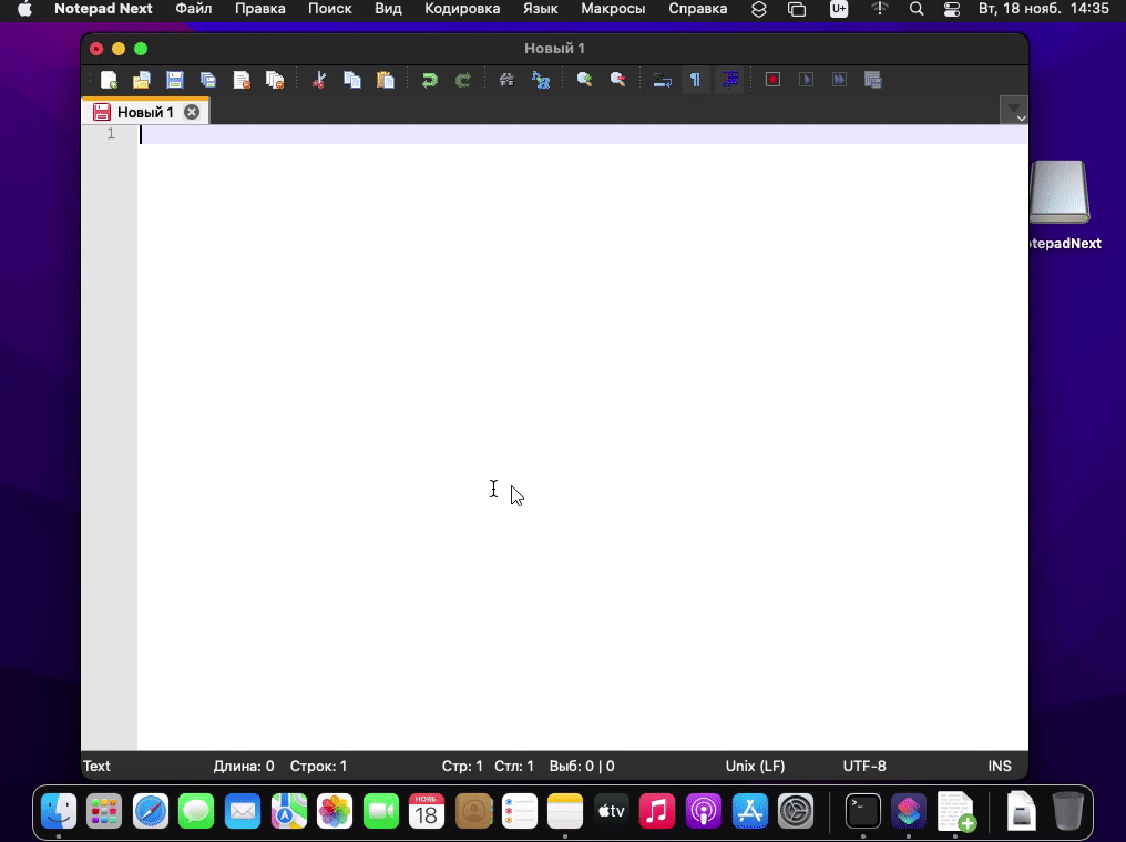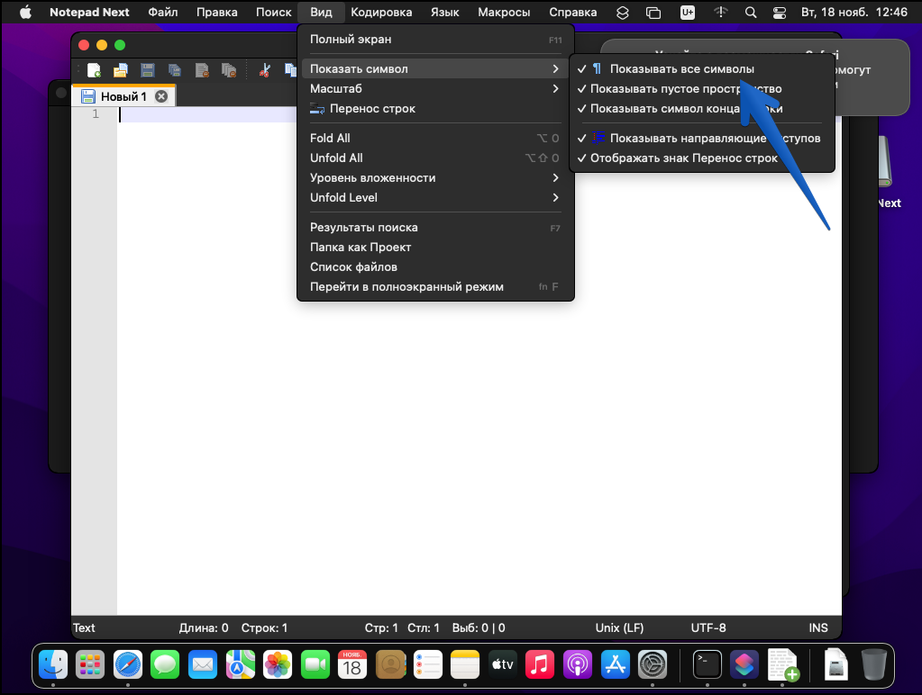 Для проверки передачи GS разделителя рекомендуем использовать NotepadNext. После того как Вы скачали и запустили NotepadNext, заходим в Вид -> Отображения символов -> Отображать все символы (рис. 9). Так Вы сможете увидеть передает ли сканер GS разделитель или нет.