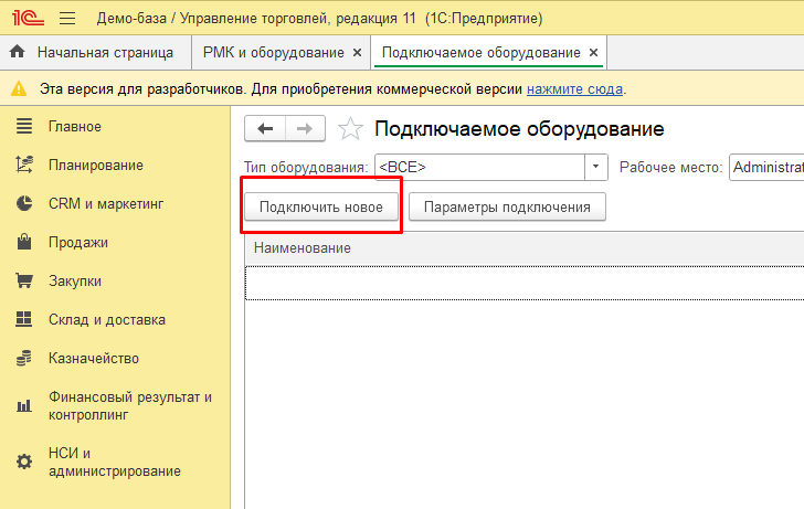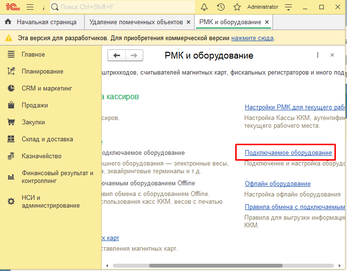 В программе 1С найти раздел НСИ и администрирование – РМК и оборудование – Подключаемое оборудование (рис.3).