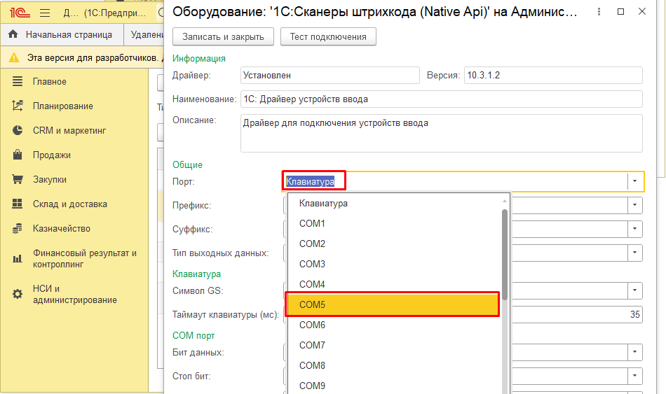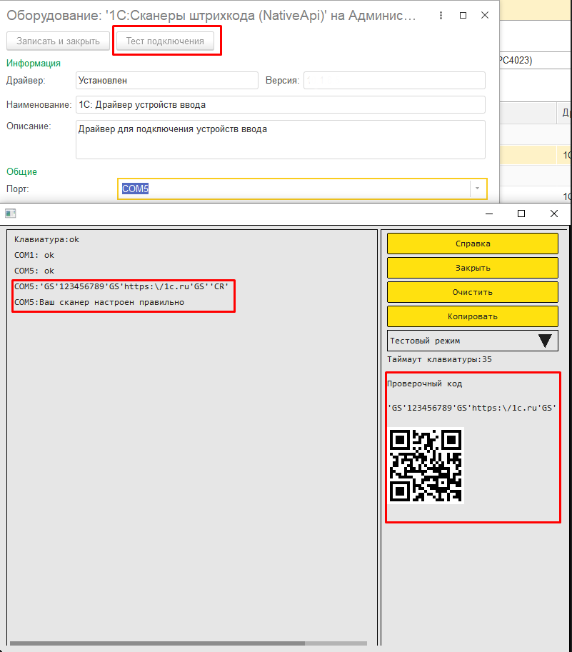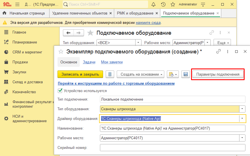 Драйвер оборудования – выбрать из списка драйвер 1С:Сканеры штрихкода (NativeApi);