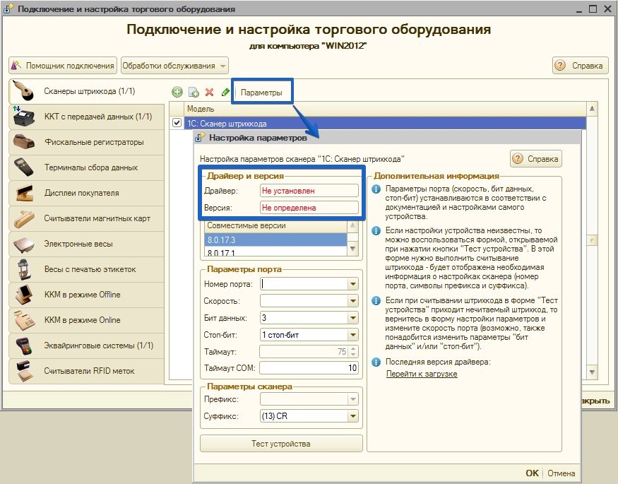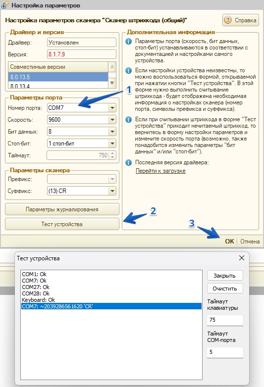 После выполнения установки драйвера при обращении к параметрам оборудования в базе 1С в сведениях драйвера будут отображаться «Установлен», в версии - та версия, которую Вы установили. Остается выбрать для сканера «Номер порта» - COM7 (для нашего примера). Ниже можно выполнить Тест_устройства, нажав соответствующую кнопку. Для сохранения параметров нажмите кнопку ОК (рис.8).