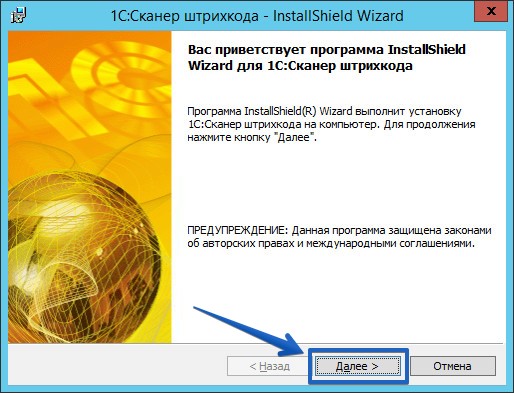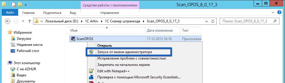 После того, как файл универсального драйвера «1С: Сканер штрихкода» скачан, необходимо установить его на рабочем месте. Когда настройка касается удаленного рабочего стола (RDP), то установить драйвер нужно на удаленной системе. Рекомендуется запускать файл установки «от имени администратора» (рис.2), в противном случае можно получить ситуацию, как уже было показано на рис. 1 "ДРАЙВЕР НЕ УСТАНОВЛЕН".