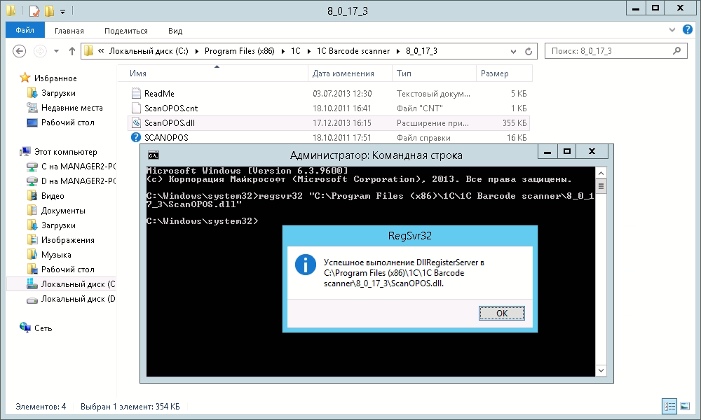 regsvr32.exeЗарегистрируйте компоненту «ScanOPOS.dll» из каталога, куда был установлен драйвер «1С: Сканер штрихкода» - по умолчанию