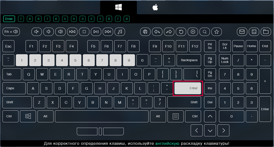 Снова воспользуйтесь сайтом key-test.ru. При успешной настройке после сканирования любого штрихкода на виртуальной клавиатуре должна срабатывать клавиша Enter.