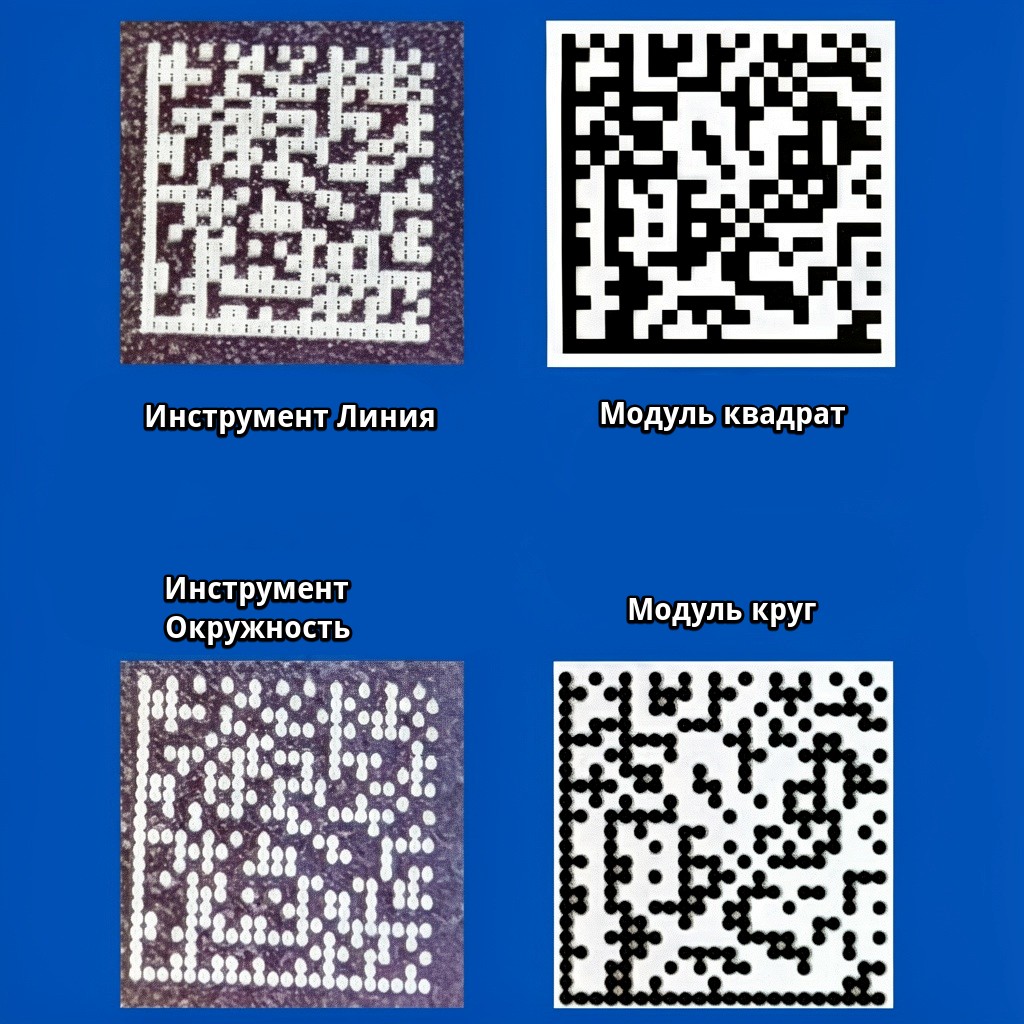 Пример нанесения с помощью разных инструментов кода DM лазерным маркиратором (рис.1)
