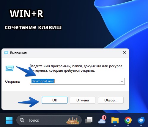 Нажать клавиши Win+R на клавиатуре, ввести devmgmt.msc и нажать Enter (рис.1).