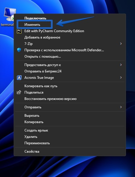 4. Перед подключением к удаленному рабочему столу, нажмите на соотвествующем ярлыке правой кнопкой мыши и выберите Изменить (рис.3).