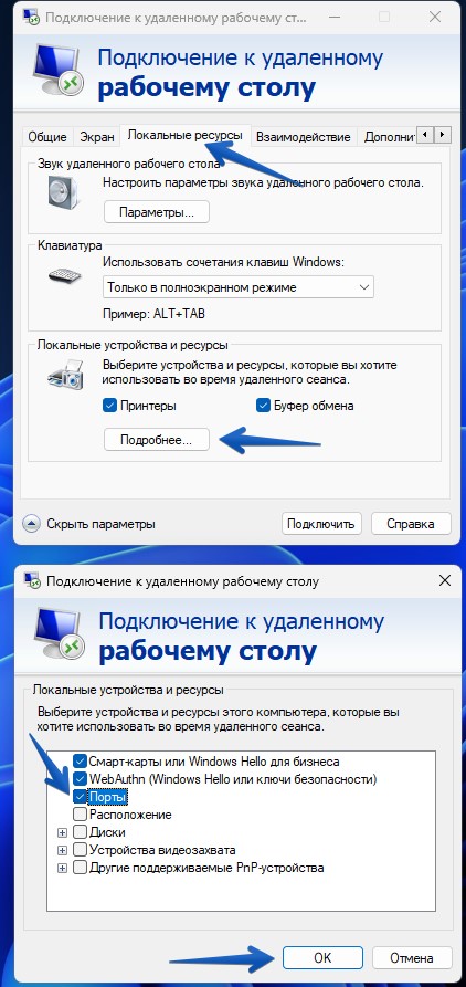 5. Далее выберите вкладку Локальные ресурсы -> Подробнее и отметьте галку напротив параметра Порты, после чего нажмите ОК (рис.4).