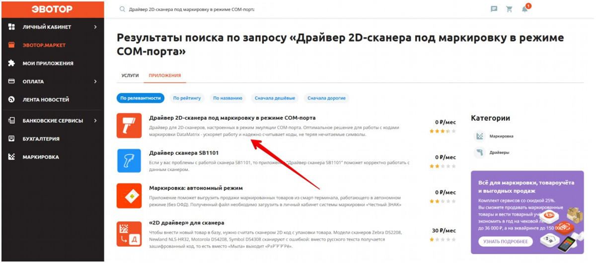 3. В поисковой строке введите название драйвера «Драйвер 2D-сканера под маркировку в режиме COM-порта» и выберите его в списке. Либо перейдите по прямой ссылке на драйвер (рис.2).