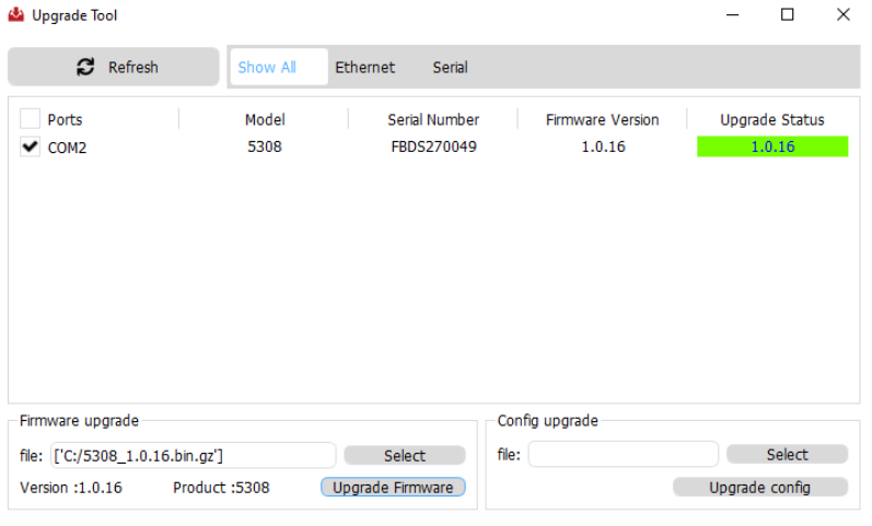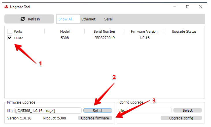 Поставьте галочку напротив COM порта вашего устройства, нажмите «Select», выберите файл прошивки из корневого каталога и нажмите «Upgrade firmware» (рис.5).