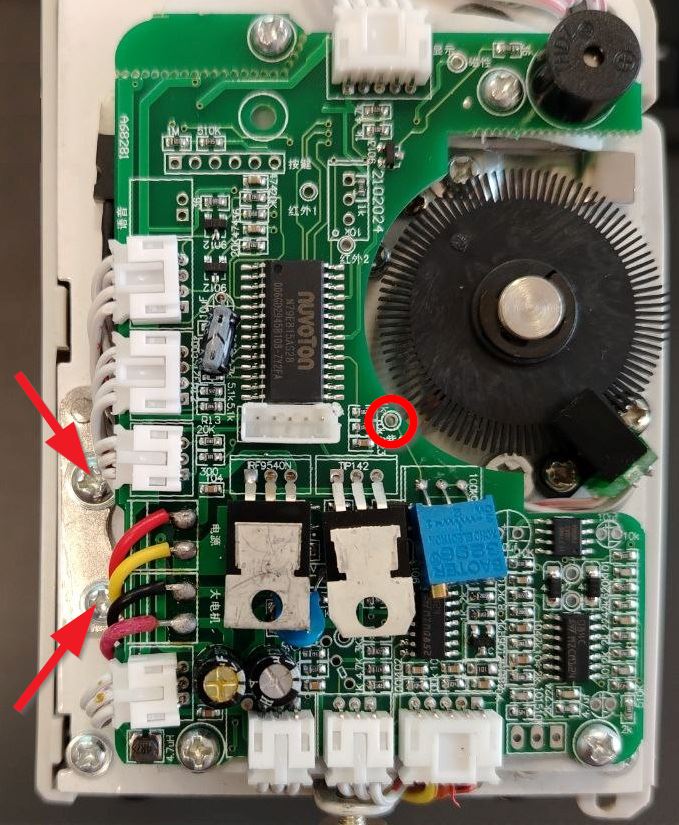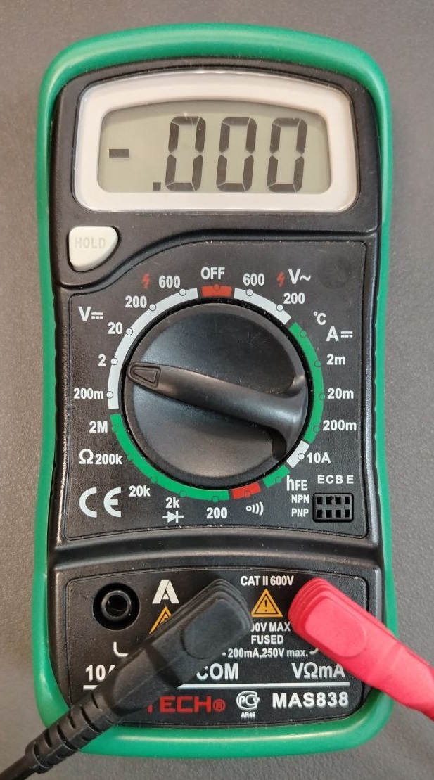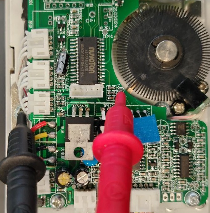 На включенном счетчике щупы мультиметра необходимо расположить на массу счетчика и тестовую точку на плате (рис. 3, рис. 4).