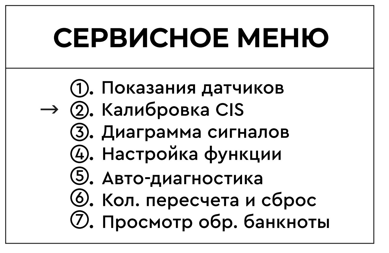 3. На дисплее отобразится сервисное меню. Выберите пункт «2. Калибровка CIS» и нажмите кнопку МЕНЮ (рис. 4)