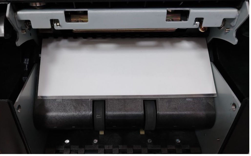 4. При входе в данный режим на экране появится инструкция по калибровке. Калибровка проводится специальным калибровочным шаблоном (входит в комплект поставки счетчика). Откройте заднюю крышку, расположите калибровочный шаблон в тракте счетчика на уровне CIS датчика. Правильная установка калибровочного шаблона показана на рис. 5.