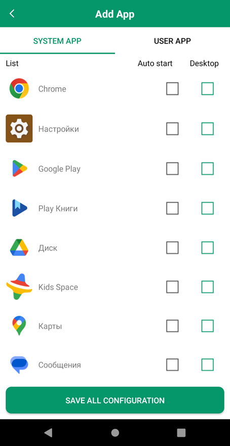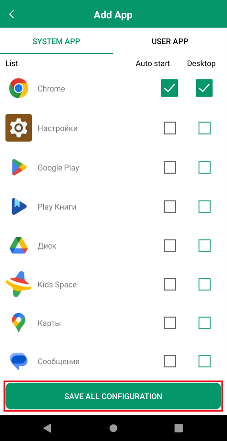 Теперь снова нажмите «+», выберите из списка приложения, которые будут доступны в режиме киоска на рабочем столе приложения (desktop), также вы можете выбрать приложение для автоматического запуска (auto start):