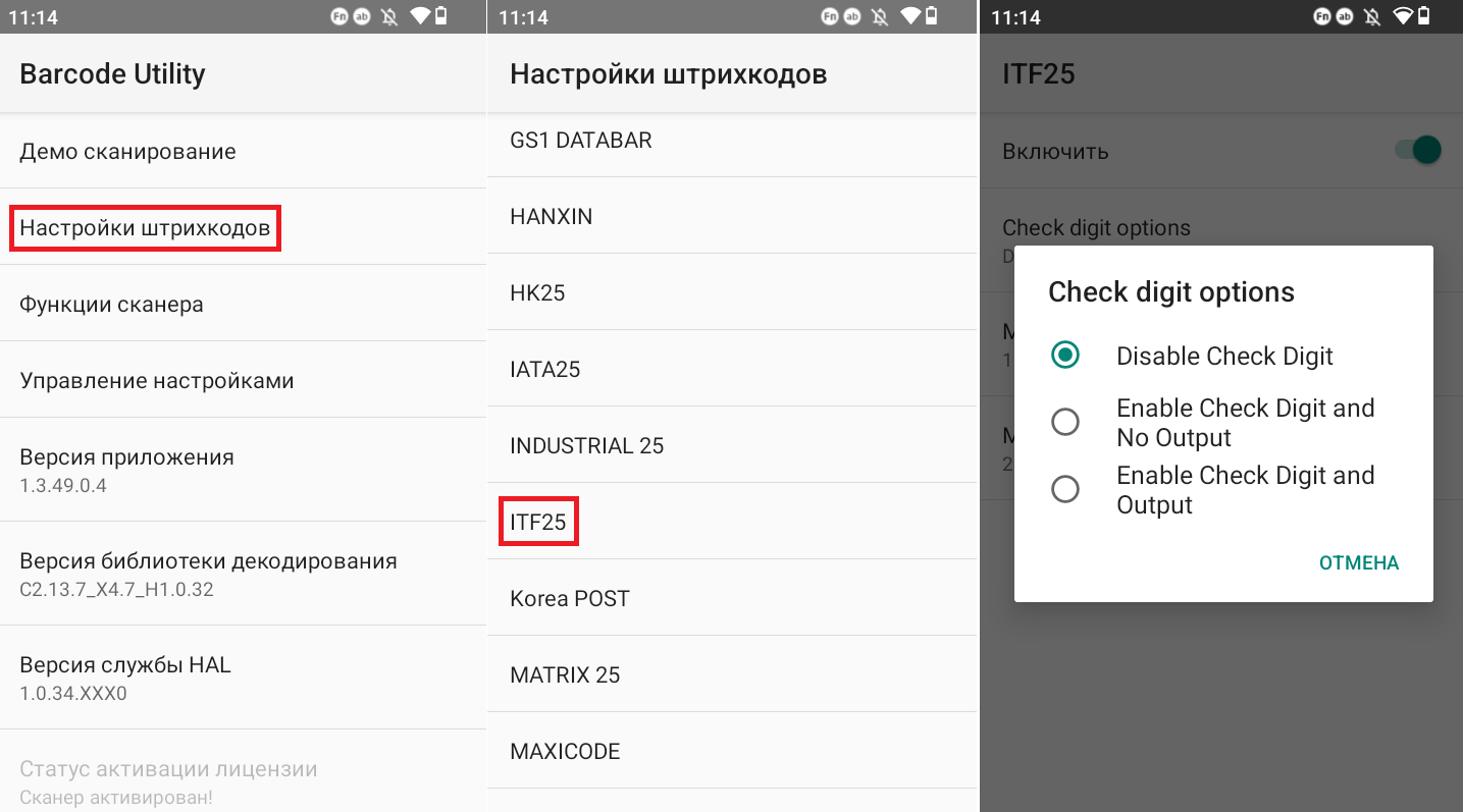 Если интерфейс на русском языке, тогда перейдите в «Настройки штрихкодов» → «ITF25» → «Disable Check Digit».