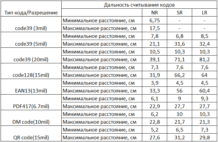 Таблица с данными о дальности сканирования разных типов кодов на ТСД MERTECH MovFast.