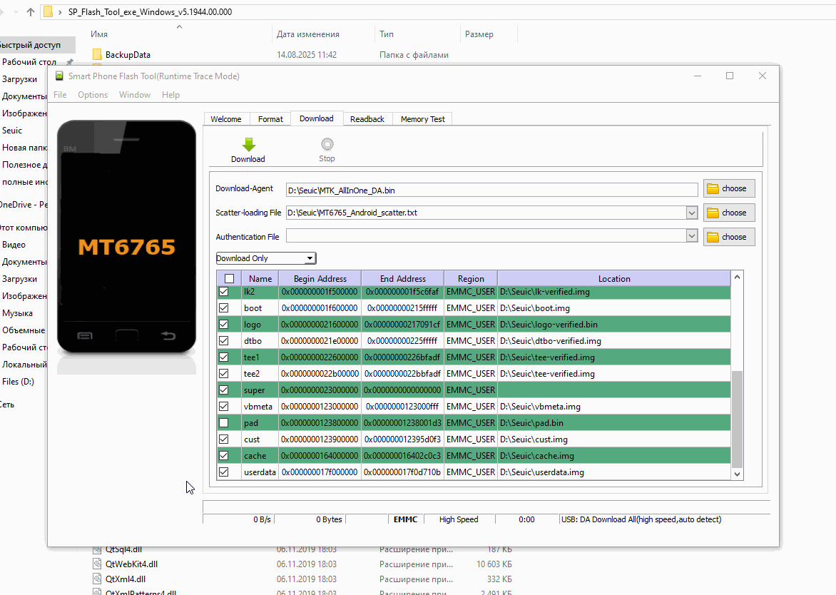 В поле Download-Agent выбираем файл с именем MTK_AllInOne_DA.bin, а в Scatter-loading File - MT6765_Android_scatter.txt из папки с прошивкой (не из папки с программой SP Flash Tool). Поле Authentication File остается пустым.