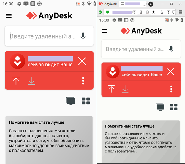 8. При запуске AnyDesk и установке соединения, необходимо выбрать пиктограммы доступа для управления функционалом ТСД и подтвердить выбор кнопкой «Принять».