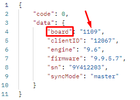 3. На данном этапе следует обратить внимание на строку «board», в данном случае значение «1109», это указывает на то, что данная плата поддерживает Rest Api v2. Если в ответе будет указанно «board»: “1808” - такая плата не поддерживает Rest Api v2, пример показан на рисунке 3.