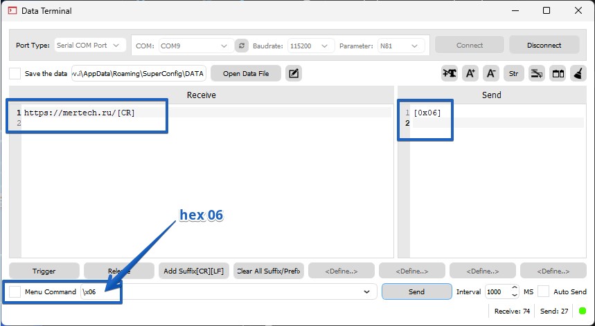 Шаг 2: Отсканируйте штрих-код один раз, а затем отправьте команду подтверждения ACK (шестнадцатеричное число 06) для получения данных штрих-кода.