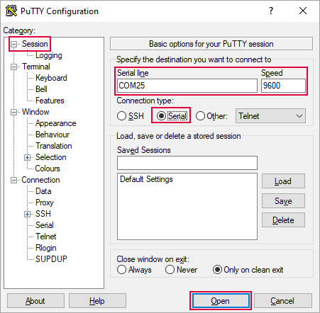 Перейдите в раздел Session, выберите тип соединения Serial, укажите номер COM-порта и скорость (Speed).