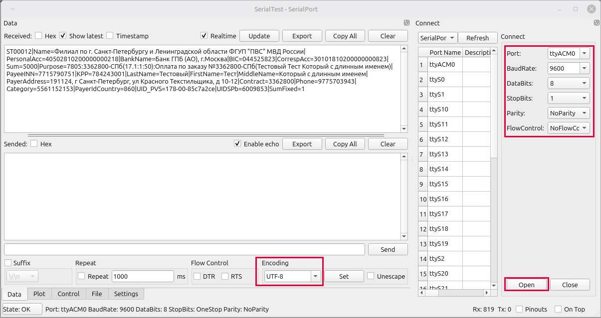 Если в тестовых утилитах данные отображаются верно, а в целевом ПО — нет, измените кодировку приема в настройках вашего программного обеспечения.