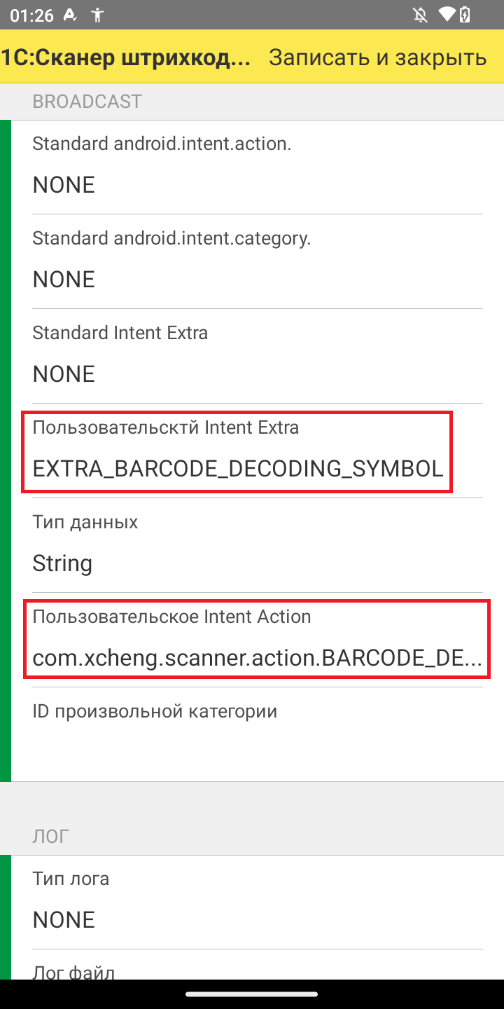 Пользовательское Intent Action: - com.xcheng.scanner.action.BARCODE_DECODING_BROADCAST.