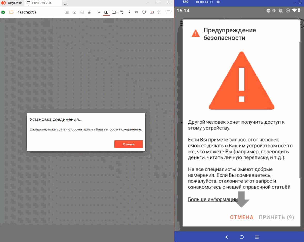 6. При запуске AnyDesk и установке соединения выберите требуемые Вам параметры доступа для управления функционалом ТСД и подтвердите выбор кнопкой «Принять». Пример подключения к ТСД на рисунке ниже.