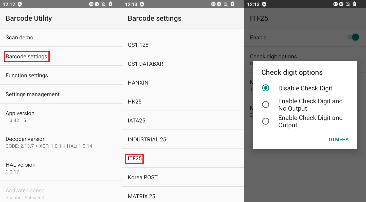 Если интерфейс на русском языке, тогда перейдите в «Настройки штрихкодов» → «ITF25» → «Disable Check Digit».