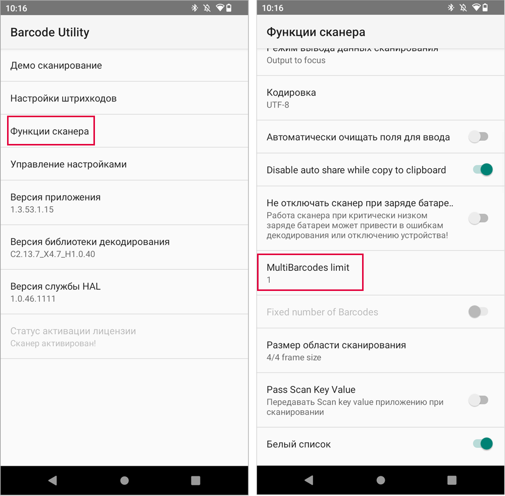Если пункт MultiBarcodes limit отсутствует, необходимо обновить прошивку ТСД до актуальной версии. Инструкция по OTA-обновлению.