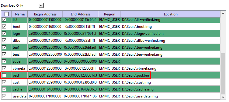 Для правильной прошивки необходимо снять галочку с пункта Pad, как показано на изображении ниже.