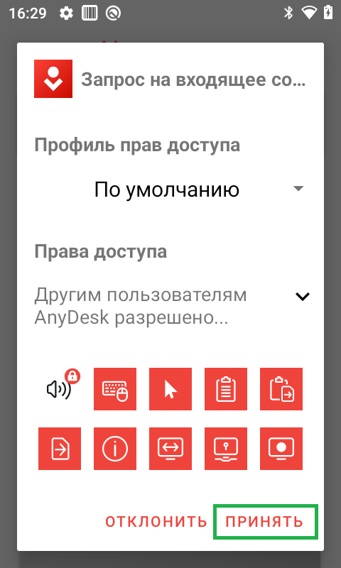 8. При запуске AnyDesk и установке соединения, необходимо выбрать пиктограммы доступа для управления функционалом ТСД и подтвердить выбор кнопкой «Принять».